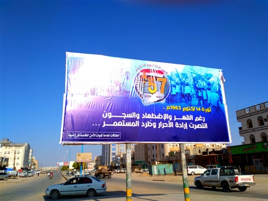 بدأت محافظة شبوة استعدادها، للاحتفال بالذكرى الـ 57 لثورة 14 من أكتوبر المجيدة واكتست شوارع مدينة عتق، والمؤسسات العامة بأعلام الجمهورية اليمنية، ورفعت صور فخامة...