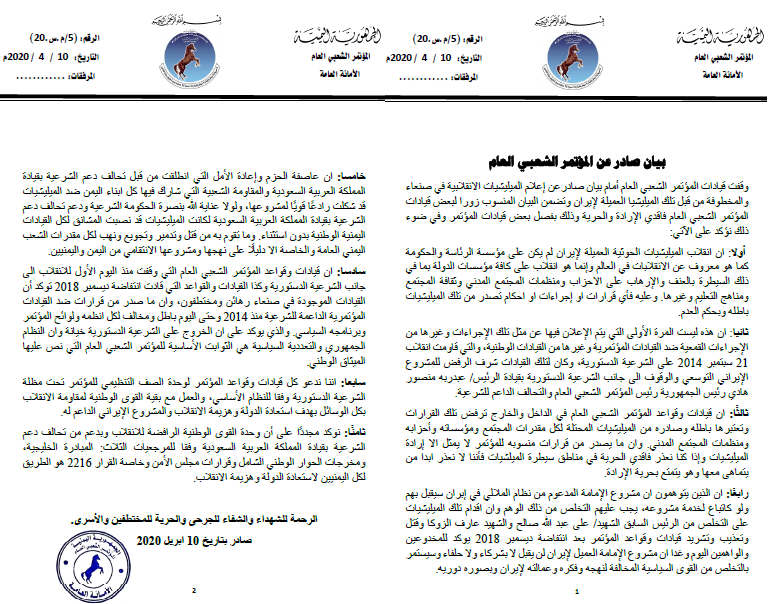 اعلن تحالف دعم الشرعية في اليمن وقف إطلاق نار شامل في اليمن لمدة أسبوعين اعتباراً من يوم الخميس الموافق (16 شعبان 1441ه / 09 ابريل 2020م) س (1200) بالتوقيت المحلي قابلة...