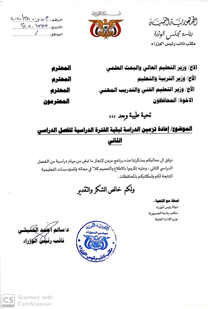 وجه نائب رئيس الوزراء سالم الخنبشي وزارات التربية والتعليم الفني والتعليم العالي باستمرار تأجيل الدراسة في المدارس والكليات وكليات المجتمع وإعادة تزمين الدراسة...
