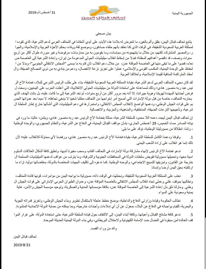 أصدر تحالف قبائل اليمن، بيانا عاجلا، حول المستجدات المؤسفة التي شهدتها المحافظات الجنوبية، من قبل دولة الإمارات العربية المتحدة، ومليشياتها الانفصالية.