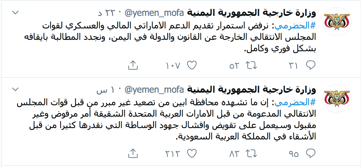 دعت وزارة الخارجية بالحكومة الشرعية،، دولة الإمارات العربية المتحدة إلى وقف الدعم المالي والعسكري عن القوات التابعة للمجلس الإنتقالي الجنوبي، الخارجة عن القانون...
