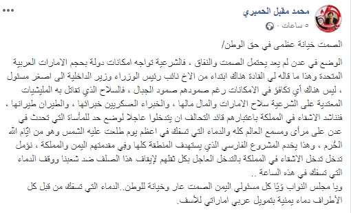 أكد الأكاديمي الإماراتي المقرب من محمد بن زايد، عبدالخالد عبدالله يوم أمس، وقوف بلاده وراء انقلاب المجلس الانتقالي الجنوبي على الشرعية في العاصمة المؤقتة عدن.