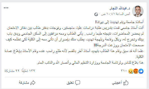 وجه الدكتور عبدالله النجار، الأكاديمي بكلية التربية بجامعة صنعاء، بلاغاً للنائب العام، بمناطق سيطرة الحوثيين، بعد تعرضه للتهديد من قبل طالب ماجستير حوثي.