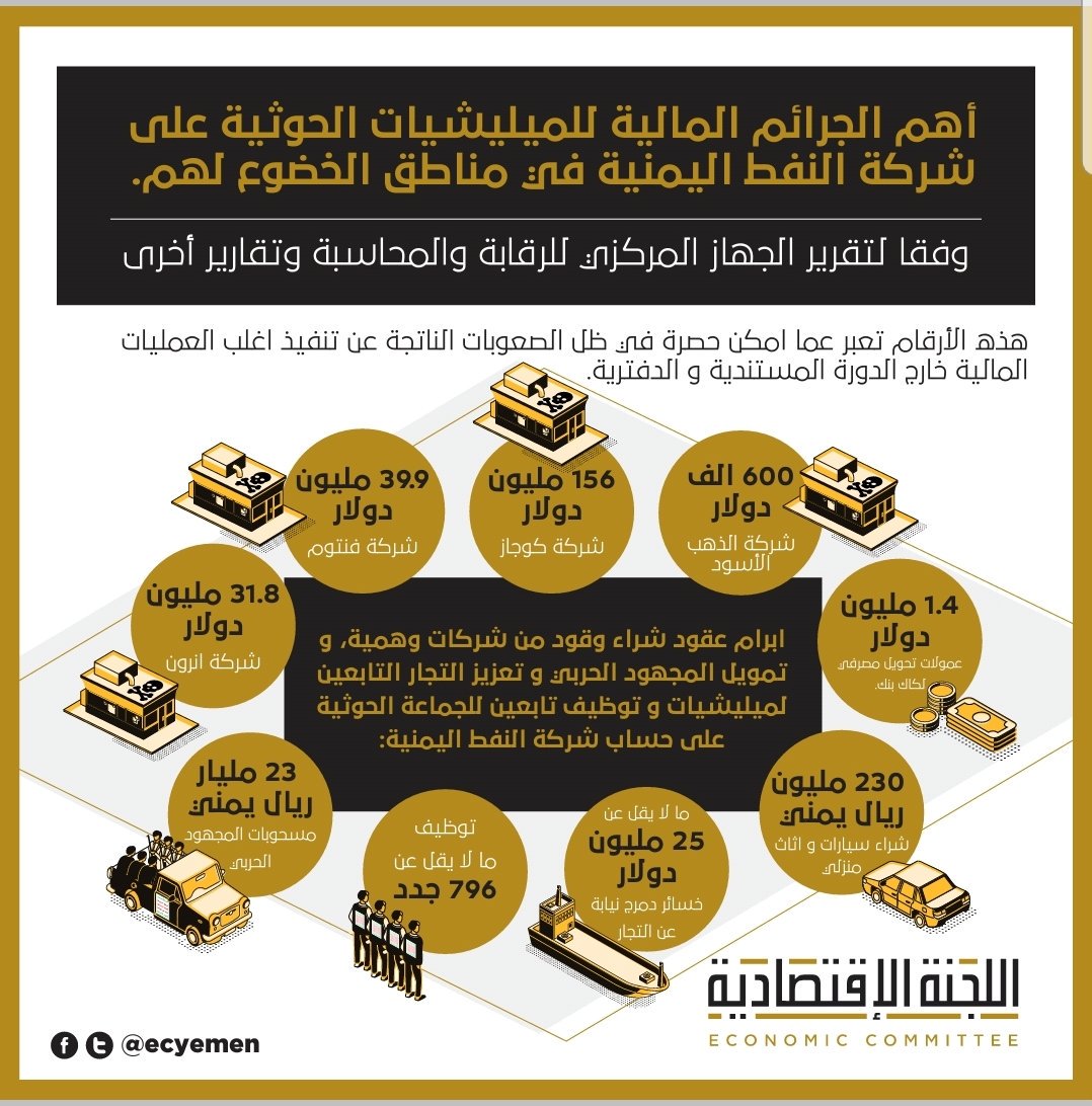 كشف تقرير للجنة الاقتصادية العليا التابعة للحكومة اليمنية، عن جرائم مالية ارتكبتها ميليشيا الحوثي الانقلابية عبر بوابة شركة النفط في المناطق الخاضعة لسيطرتها.
