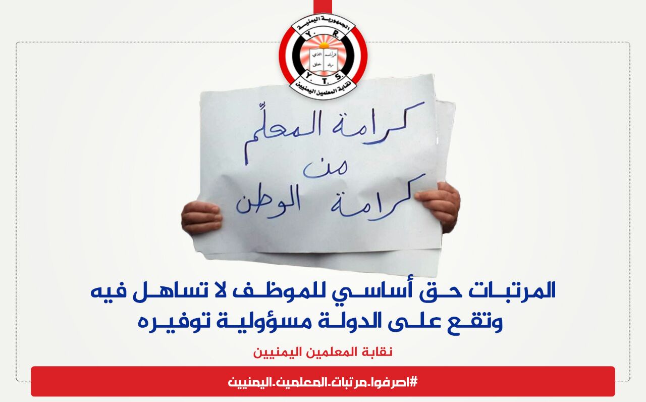 أطلقت نقابة المعلمين اليمنيين يوم أمس حملة إعلامية للمطالبة بصرف المرتبات تحت شعار "كرامة المعلم من كرامة الوطن" بالترافق مع هاشتاق في شبكات التواصل الاجتماعي بوسم...